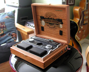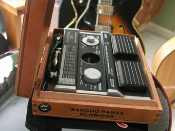 2007 January: Cool.....Pedal Board? Since the very early 80's I had assembled a pedal board of 4 or 5 stomp boxes I typically used. A tuner, a delay or two, a chorus or whatever was in fashion over the years. I still have an old Arion powered board that has been reliable and sturdy. However, these days I like to travel light. A guitar or two, an amp. Still I wanted an in-line tuner and possibly a delay for slap back echo. Trem and reverb (my two favorites effects) are usually stock in the amp I'll bring. I got the idea after seeing the Korg AX3G on sale at Musician's Friend for $49.99. I bought one and decided that I would program some basic variations on slap back. This little box is pretty remarkable for all the sounds it packs (most of which I will never have use for in my life time). Great reverb, great echo and a tiny package. I got to thinking though that this frail little plastic toy won't stand a chance in the real world AND more importantly has a vintage looks "hip" factor of -7. Below is my answer to both problems. A sturdy little cigar box servers as both a carrying case and vintage looking "Atomic Ranch hands" approved retro cool look. Spending way too much time with a Dremel tool and I soldering iron I carefully fit the AX3G into the box with velcro and various jacks. I added input and output stereo jacks and a power jack as well. The Korg can be used with the cigar box completely closed. Cool. no really.... very cool.