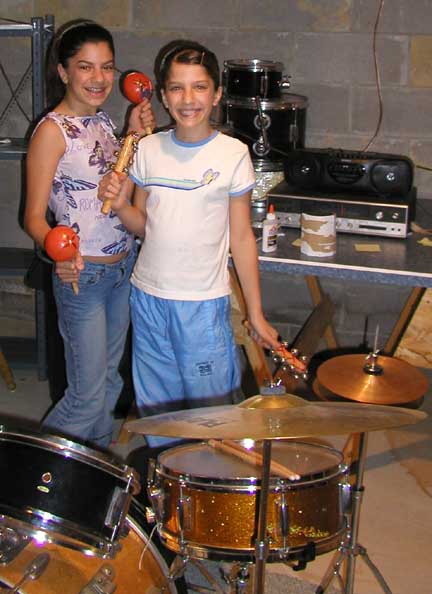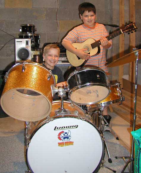 The Chumpies are going to ROCK YOUR WORLD ! My Nephews Mike and Matt. Mike is on his totally cool Slingerland drum set with cool matching Pearl snare and assorted other non Slingerland pieces. Matt is holding a guitar of Asian origin. Pictured to the right are my nieces Olivia and Alex, aka The Chumpettes !!!